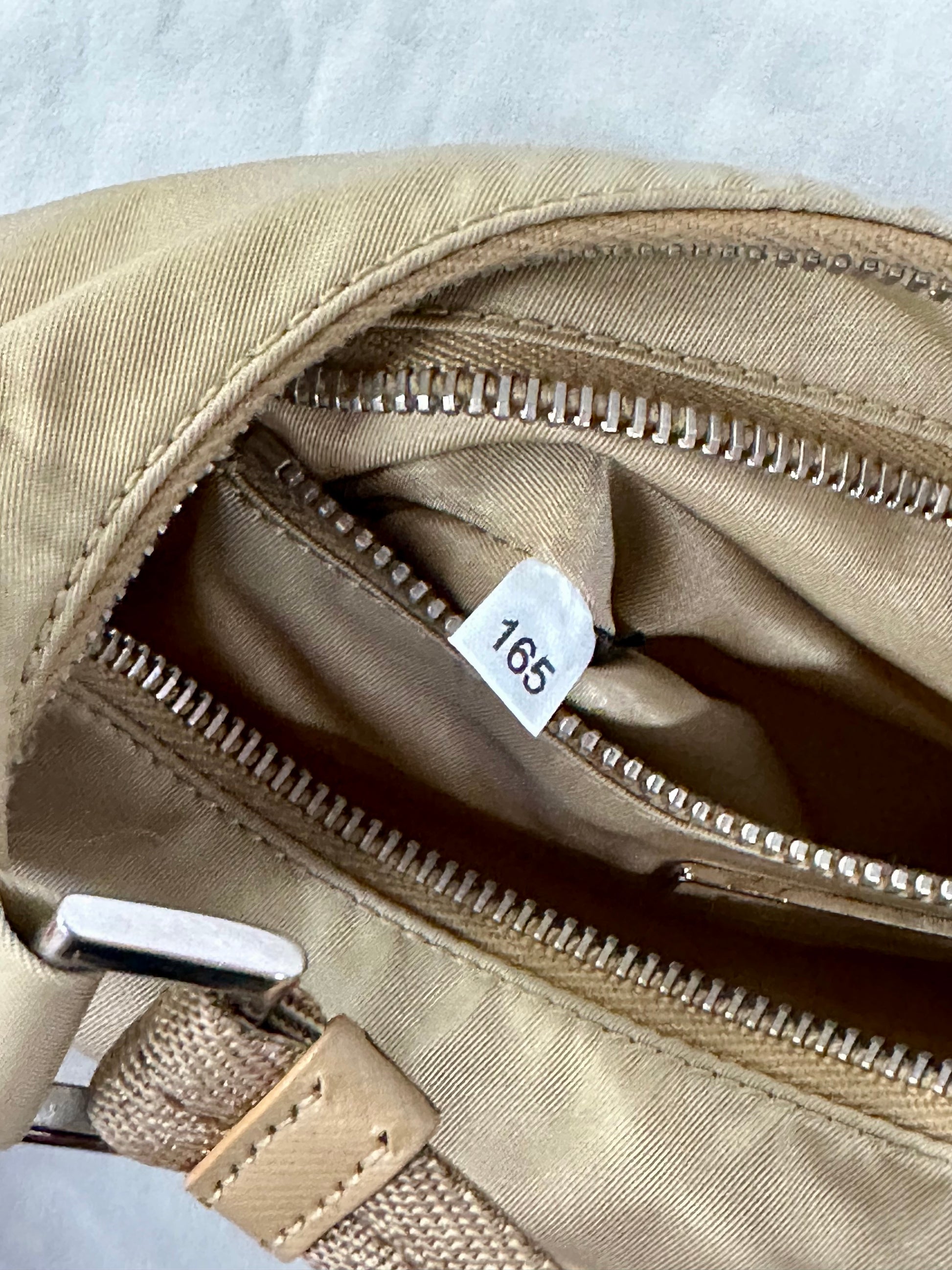 In nylon color champagne con manico in tessuto, chiusura con zip e dettagli in pelle.